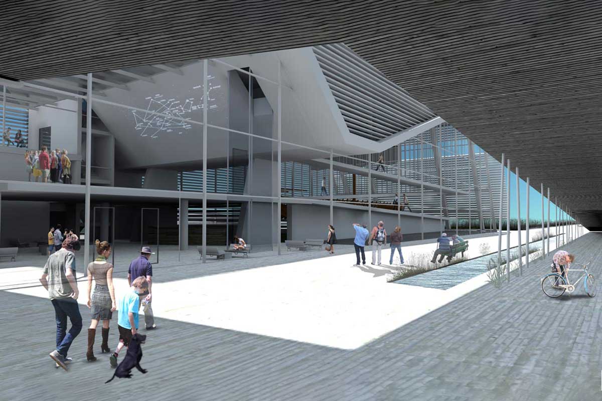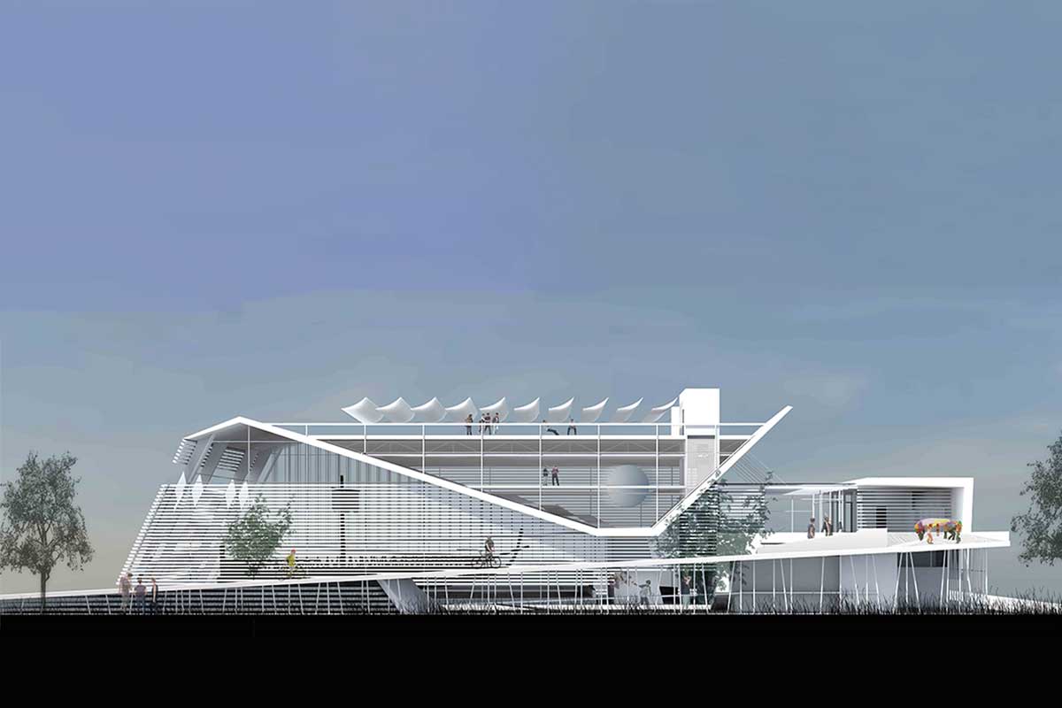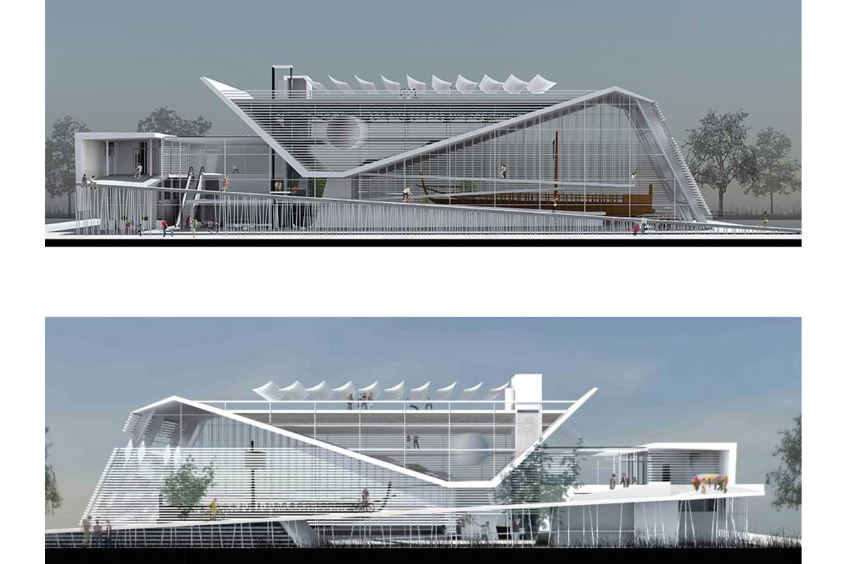 The architectural proposal consists of three parallel zones: the first is the “filter” towards the road, an inclined ramp-platform and a linear outdoor space. The second is the building itself and the third is the south zone, a green outdoor space of interactive games. The building’s spatial structure is based on a wavy bearer that creates a pair of “solid” and “void” volumes where the two basic uses are placed. Argo’s Hall is situated inside the “void – curved” volume and the Multimedia Hall inside the “solid – hollow” volume. A third spatial unity that accommodates the supplementary uses and entrance is placed underneath the wavy bearer.