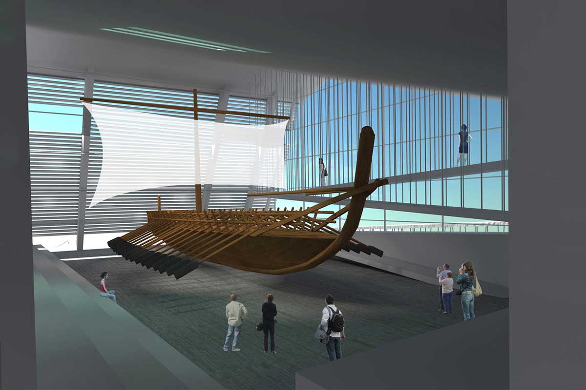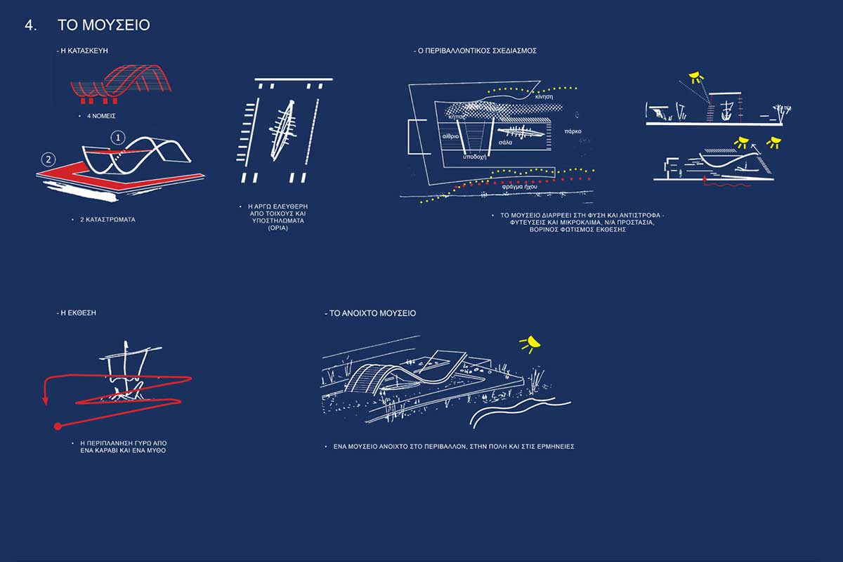 The building will receive the mythical ship of Argo after a long journey through the centuries. It will accommodate the city’s main historical emblem, popular all around the world. Along with the mythical ship, it will also accommodate the myth itself. The architectural proposal aims in creating more than a museum. Its goal is to create an environment of knowledge, learning, surprise, game and interaction, that will be able to embody and express the mythical, historical and modern aspect of the Argonautic expedition.