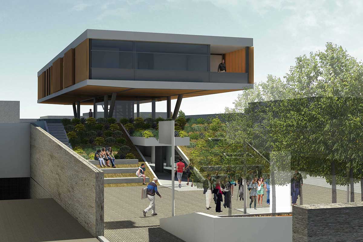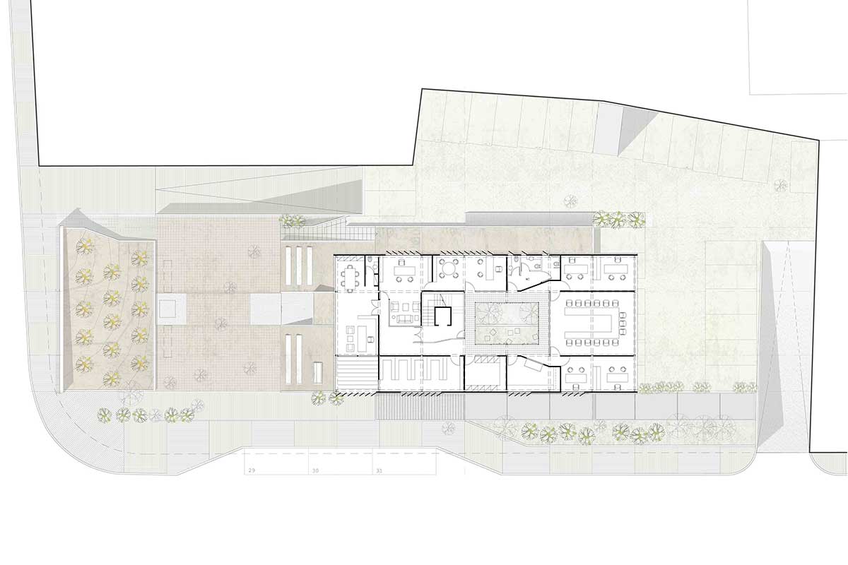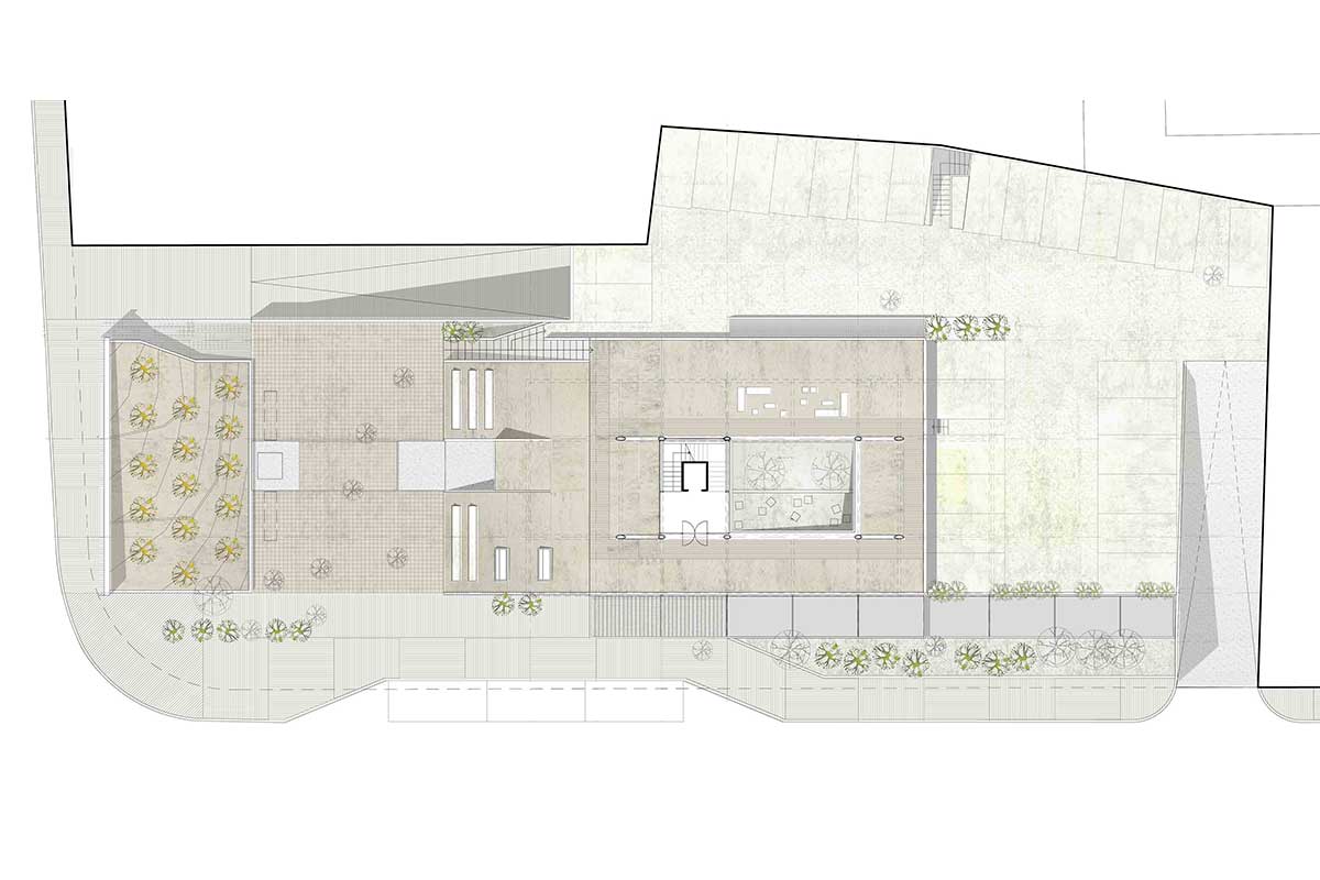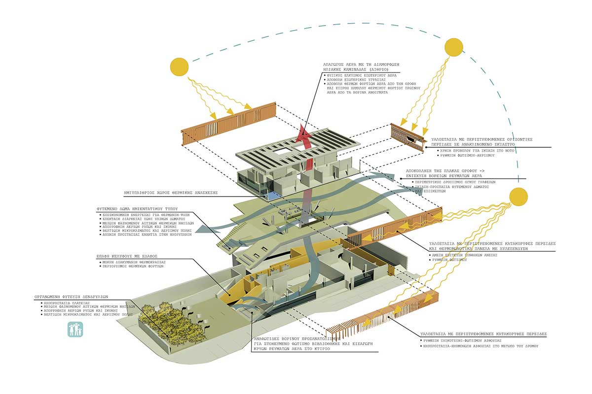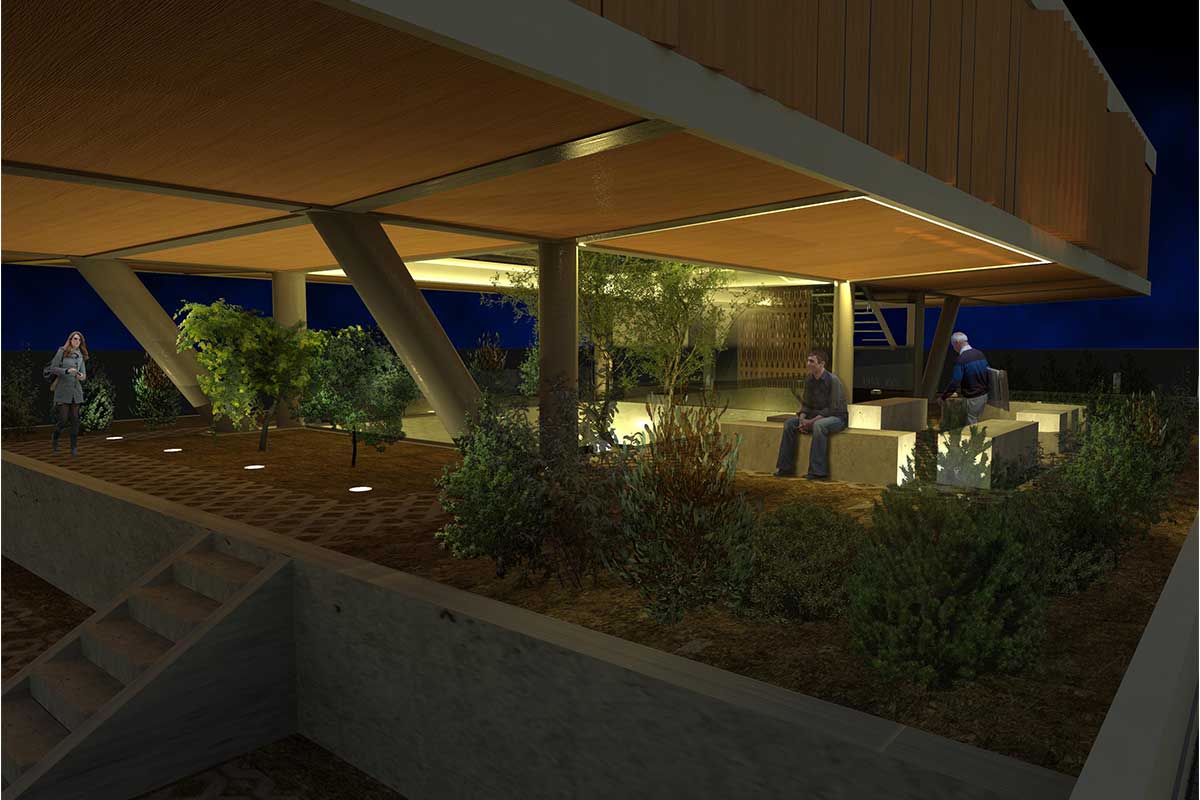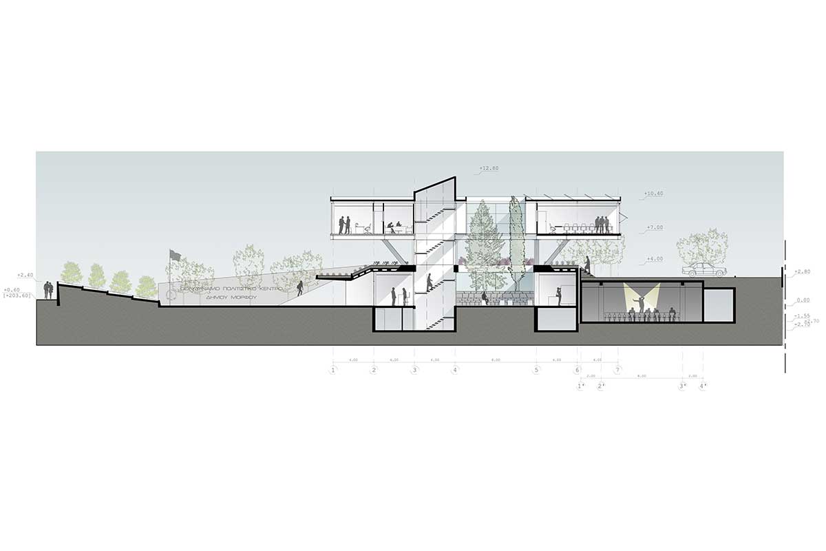 The main idea of the design was the creation of a green skyline. This is achieved with a unified planted zone, that crosses the building plot along it’s longer dimension. This zone makes use of the elevation of the ground and it creates spaces sometimes open -like the upper and lower public square- and sometimes “closed”, like the exhibition space and the event hall at the ground floor.