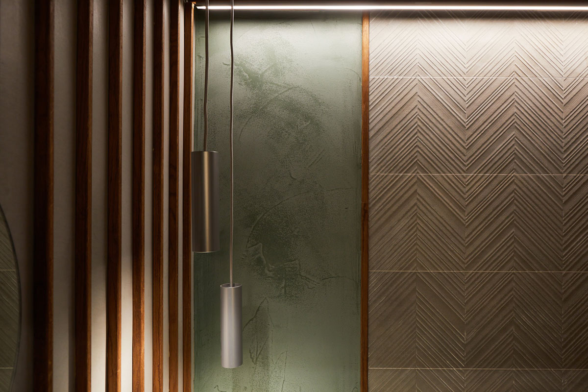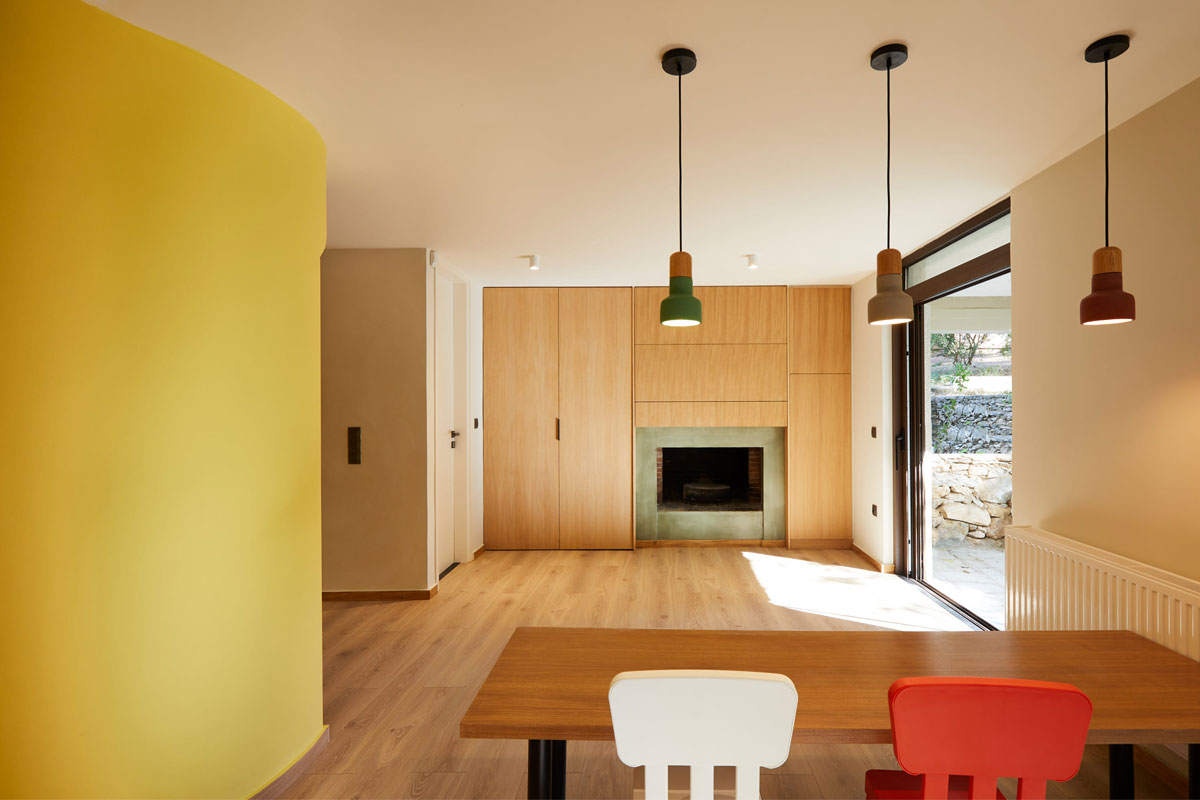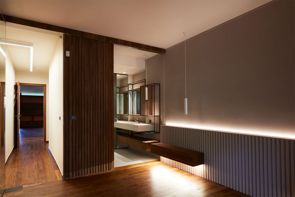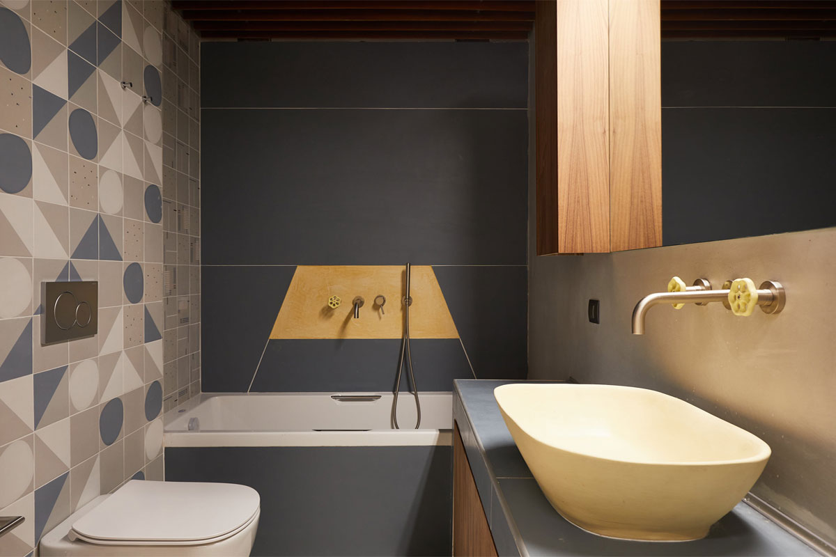 Color was one of our basic design choices in the kitchen, choosing some basic modern colors such as blue and yellow. The main kitchen space is semi divided by three custom made sliding panels. When withdrawn on the side the kitchen island is united as an extension with the dining table. A two-sided metal multi-furniture is designed among the entrance and the living room to serve as a bookcase, wine bar, radiator cover, shoe case, closet and general storage. Each bathroom is designed according to its users’ identity, a more sophisticated style for guests with earth tones, wood, embossed concrete tiles and green colored cement. The kids’ bathroom is covered with playful colors and shapes. The master bedroom takes in a semi open space bathroom that is divided by the main room with custom sliding wooden panels. When withdrawn on the side, the room acquires a sense of spaciousness. When closed the room has two uniform facades, since closets, door and sliding panels are designed as one. Bright colors and tiles are used to contrast the extended use of oak wood.