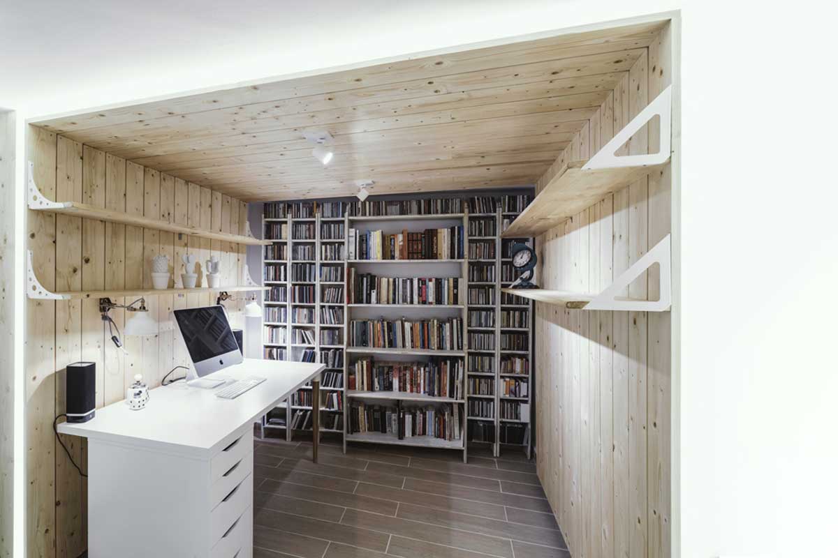The architectural tools used in this transformation of a dark and cold basement into a space of artistic creation and occasional living were the right use of artificial lighting, warm materials and colours along with the promotion of the client’s personal objects.
